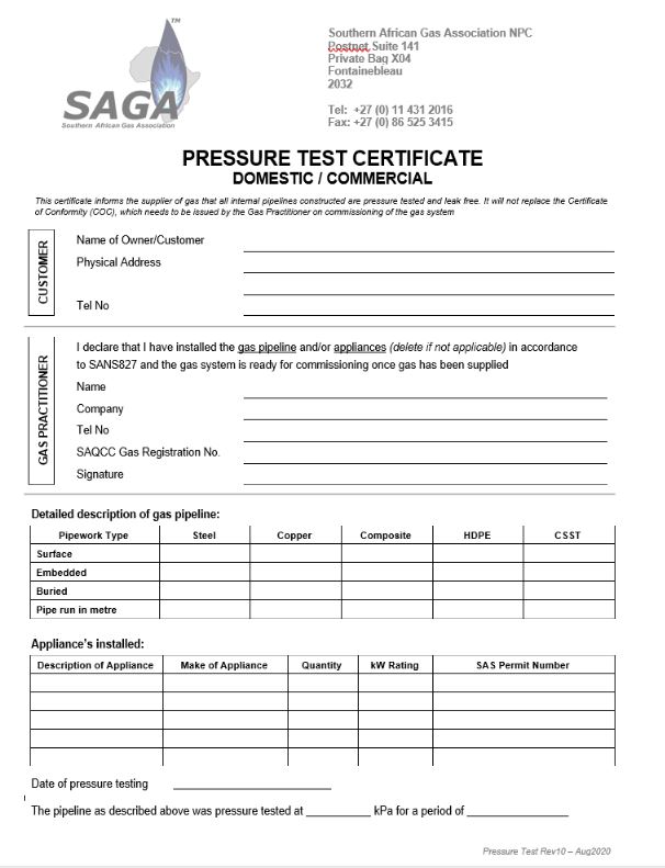 Pressure test certificate for Domestic/Commercial Installations