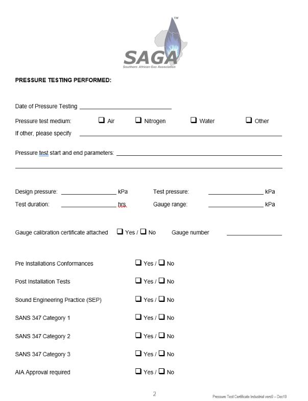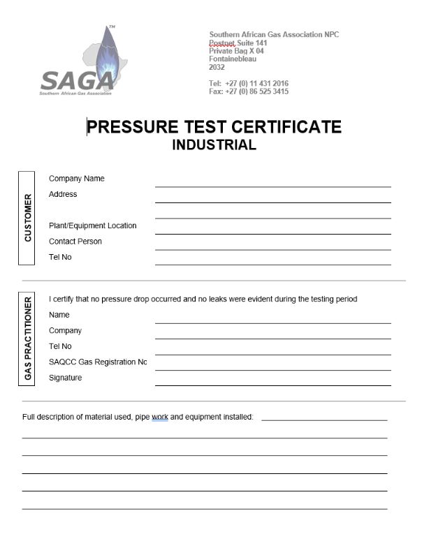 Pressure test certificate for Industrial Installations